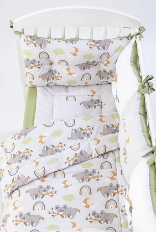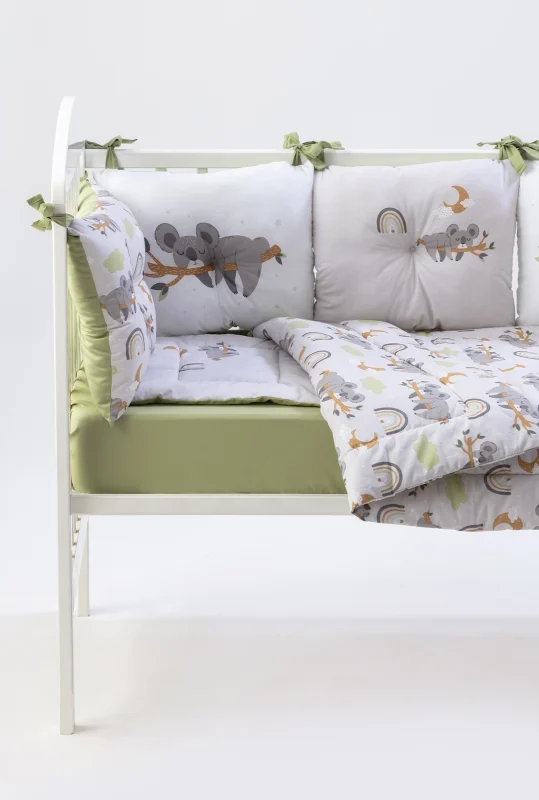 Ušuškani snovi uz najslađe koale. Ovaj šarmantni komplet posteljine i ogradice za bebe sa dezenom slatkih koala stvoren je da pruži toplinu, udobnost i sigurnost u prvim danima bebinog života.