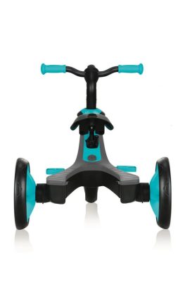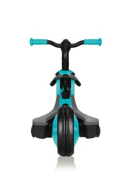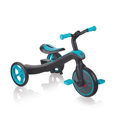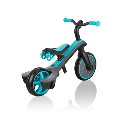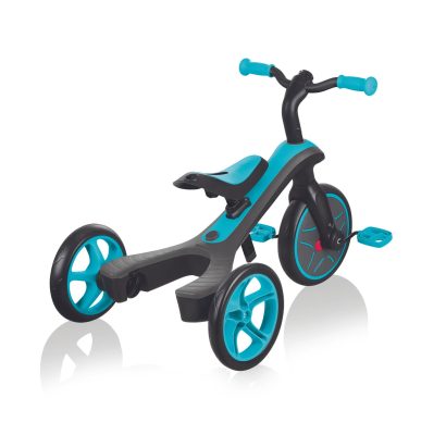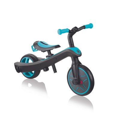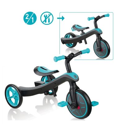 - Tricikl i balans bike 2u1 Globber, inovativnog izgleda, dostupan u crno-tirkiznoj kombinaciji, pogodan za oba pola. Maksimalna težina do 20kg, 2-3 godine može biti tricikl, posle se prilagođava razvoju deteta, i postaje balans bike (2-5). Lako je sklopiv, pedale se mogu skinuti, a zadnji točkovi se mogu montirati sa unutrašnje strane rama.