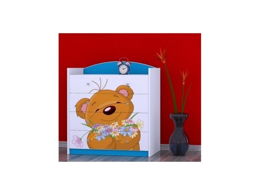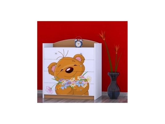 Prednje strane komode obložene su živopisnim nalepnicama koje su izrađene od ekoloških boja, potpuno bezbednih po zdravlje deteta. Komodu je predvidjeno samostalno montirati, prema priloženom uputstvu.