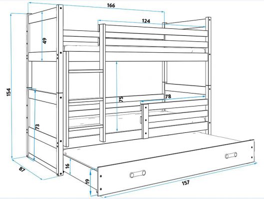 Krevet na sprat RICO 160×80 sa dodatnim ležajem je savršena kupovina za malo dete. Pogodan je i za dečake i za devojčice. Njegov okvir je napravljen od borovog drveta što olakšava čišćenje i obezbeđuje izdržljivost.