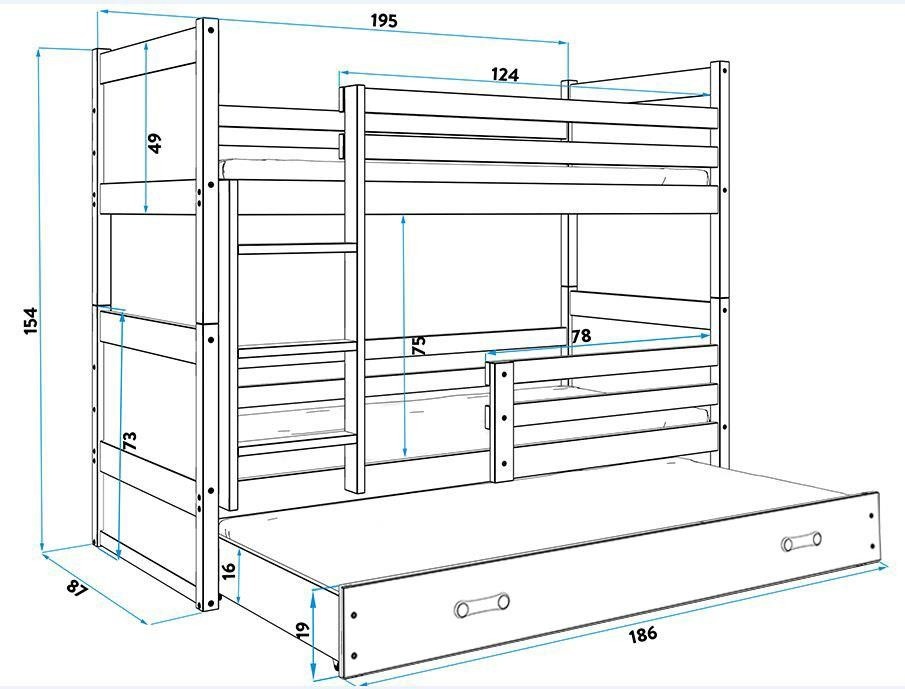 Krevet na sprat RICO 190×80 sa dodatnim ležajem je savršena kupovina za malo dete. Pogodan je i za dečake i za devojčice. Njegov okvir je napravljen od borovog drveta što olakšava čišćenje i obezbeđuje izdržljivost.