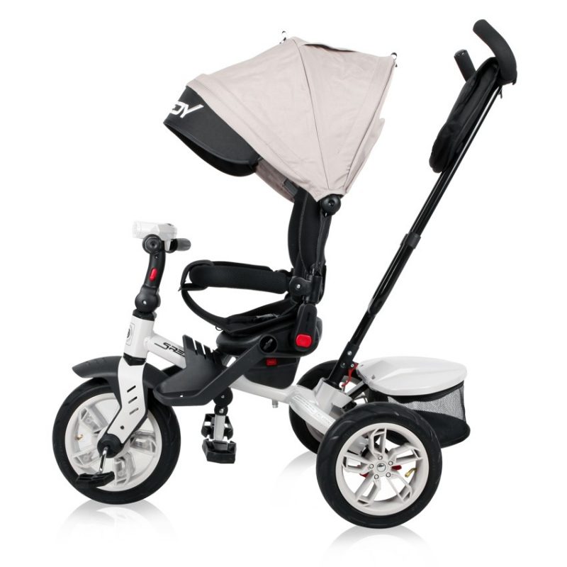 Speedy air tricikl pogodan je za decu stariju od 12 meseci. Udobno sedište koje se može okrenuti za 360 stepeni, sigurnosni pojasevi u 3 tačke, zanimljiv pribor, ali i mnoštvo opcija su samo neke od funkcija koje će oduševiti i Vas i Vaše dete.